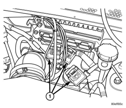 6. Connect and lock the 3 or 4 electrical connectors (1) to the Powertrain Control Module (PCM).