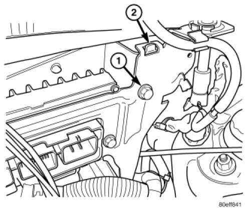 3. Locate the PCM and bracket assembly bracket on the tab (2).