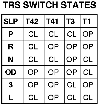 The Transmission Range Sensor (TRS) communicates Shift Lever Position (SLP) to the PCM/TCM as a combination of open and closed switches. Each shift lever position has an assigned combination of switch states (open/closed) that the PCM/TCM receives from four sense circuits. The PCM/TCM interprets this information and determines the appropriate transaxle gear position and shift schedule.