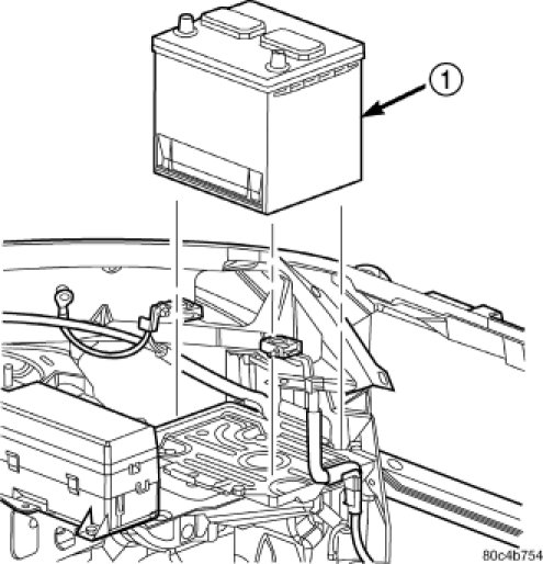 3. Remove the battery hold down clamp and remove the battery (1).