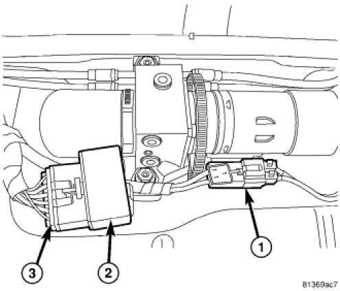 1. Position the motor/hydraulic pump relay (2) onto the relay bracket and push into place so that the retaining tab is fully seated.