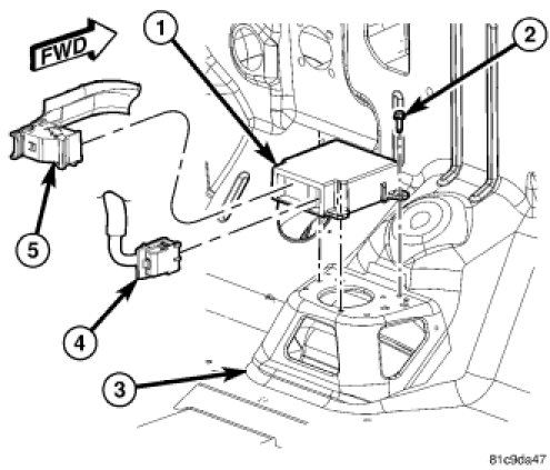 3. Reconnect the body wire harness connector (5) and the instrument panel wire harness connector (4) to the ORC connector receptacles located on the rearward facing side of the module. Be certain that the latches on both connectors are each fully engaged.