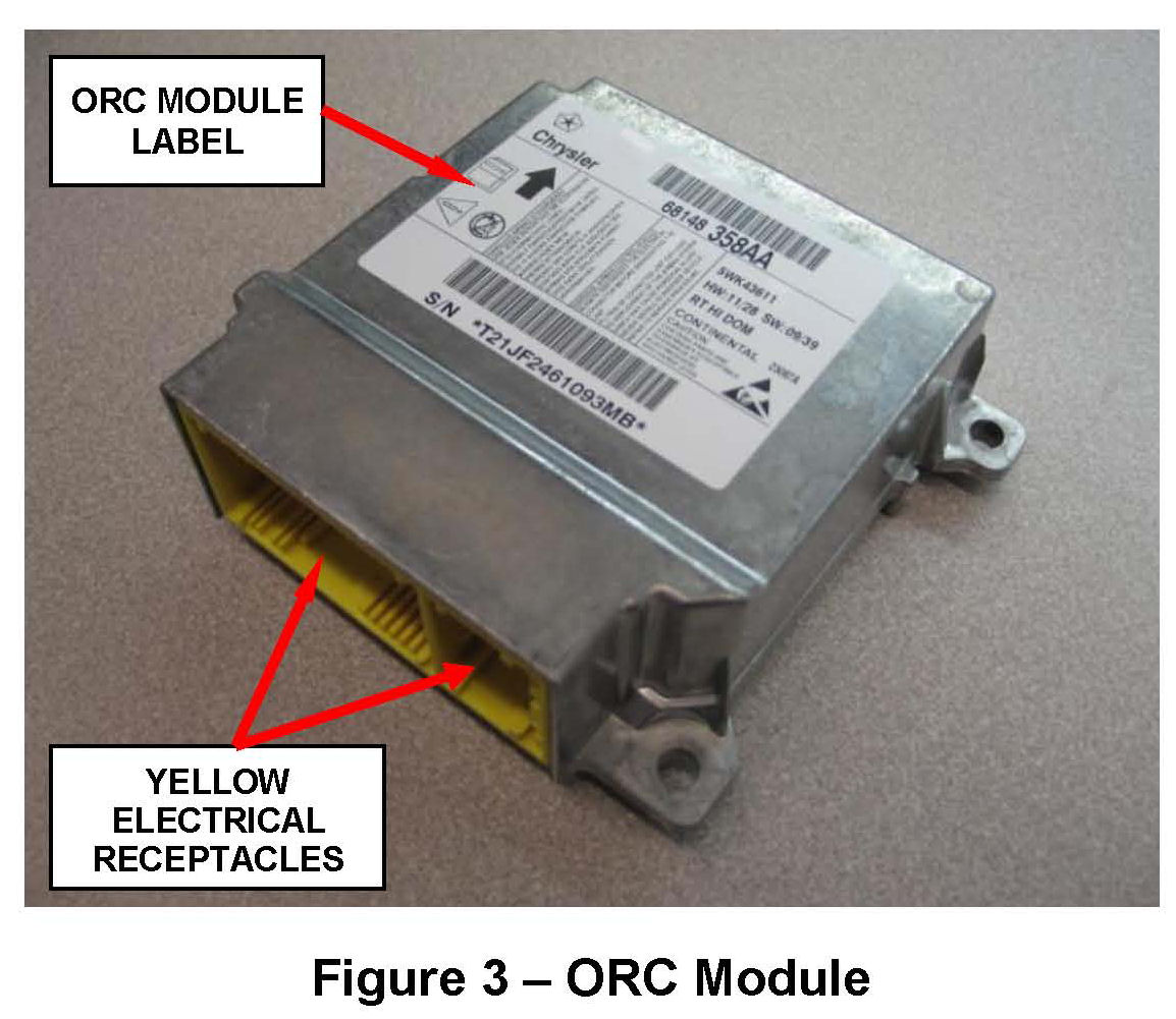 12. Reconnect the body wire harness connector and the instrument panel wire harness connector to the ORC module yellow electrical receptacles located on the rearward facing side of the module (Figure 3). Be certain that the latches on both connectors are each fully engaged.