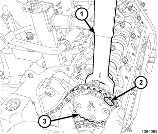 1. Using Chain Tensioner Wedge 9867 (3), stabilize the secondary chain drive. For reference purposes, mark the chain-to-sprocket position.