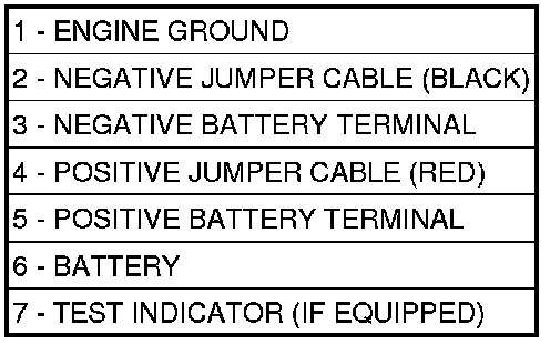 7. Allow battery in the disabled vehicle to charge to at least 12.4 volts (75% charge) before attempting to start engine. If engine does not start within 15 seconds, stop cranking engine and allow starter to cool for 15 minutes before cranking again.