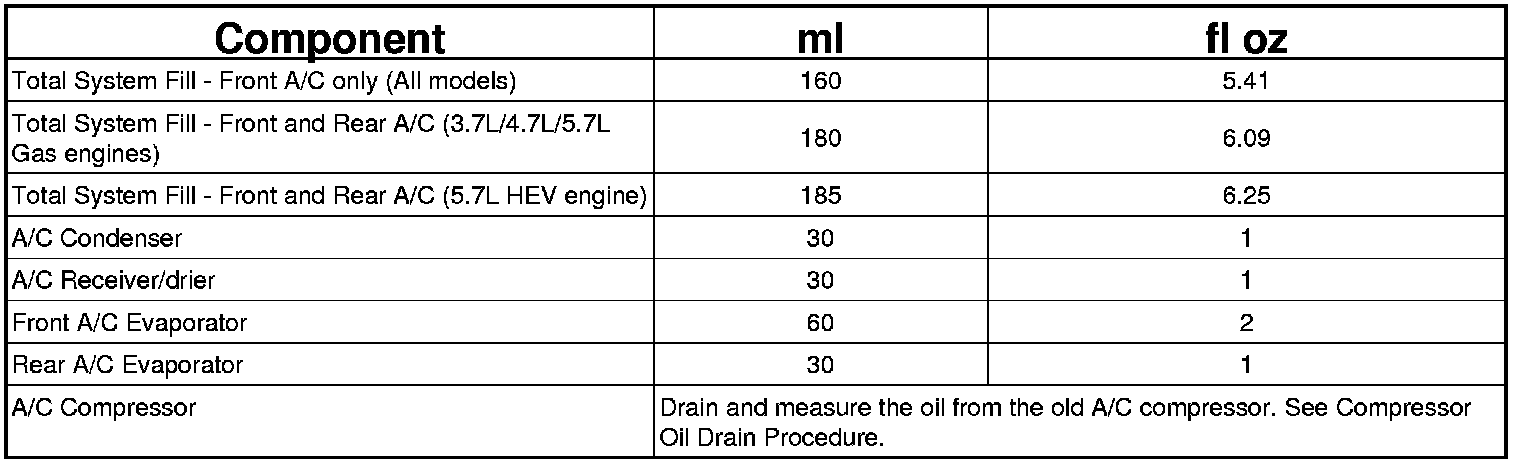 Refrigerant oil must be added when an A/C condenser, A/C receiver/drier or A/C evaporator is replaced (see Refrigerant Oil Capacities chart).