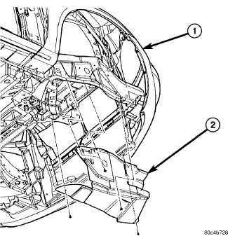 3. Carefully pull the right side of the fascia (1) downward to gain access to the screw that secures the lower front of the right side rail splash shield (2) and remove the screw.