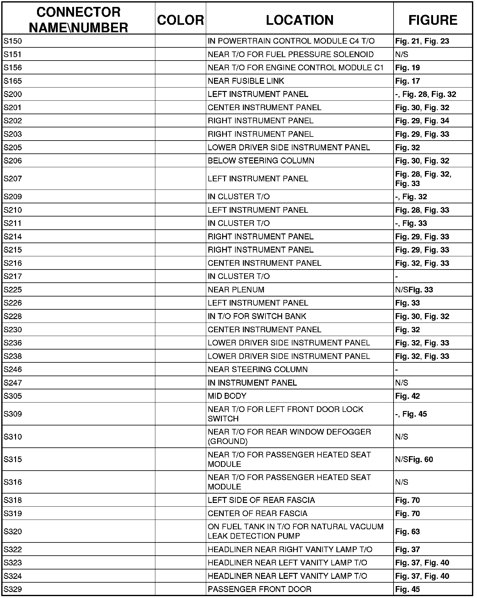 The abbreviation T/O (Take Out) is used in the location column to indicate a point in which the wiring harness branches out to a component.