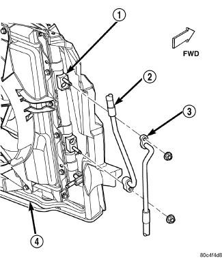 1. Tilt the radiator (4) rearward and position the A/C condenser (1) into the front of the engine compartment and install the retaining bolts. Tighten the bolts to 4.5 Nm (40 in. lbs.).