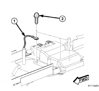 NOTE: Place the ground eyelet (1) on the passenger side front screw (2) when reattaching the ORC.