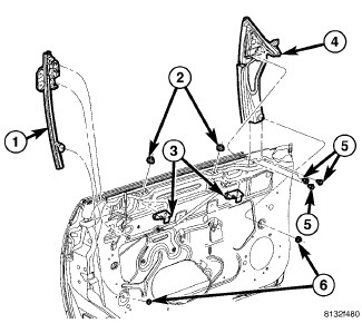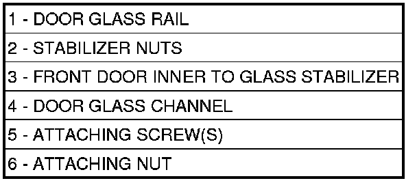 4. Using a suitable allen wrench, hold jack screw stationary while removing nut attaching bottom of rear rail (1) assembly to inner door panel.