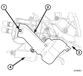 3. Install the two screws (4) that secure the heater core to the air distribution housing. Tighten the screws to 2 Nm (17 in. lbs.)