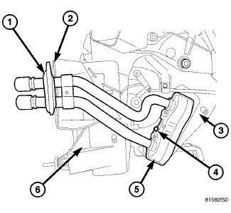 1. If removed, lubricate new O-rings with clean engine coolant and install them onto the heater core tubes. Connect the tubes to the heater core (5) and install the retaining clips.