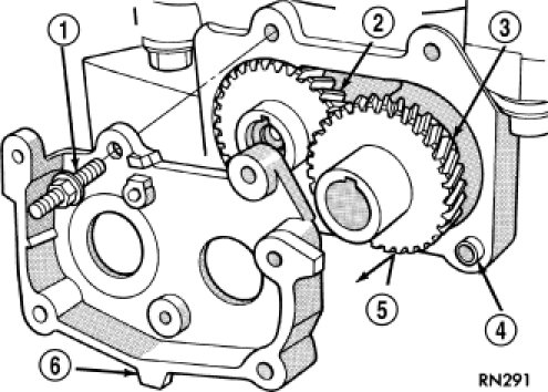 7. Remove gear cover retaining stud (1) (double ended to also retain chain guide). Remove cover (6) and balance shaft gears (5).