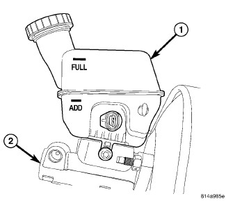 Master cylinder reservoirs (1) are marked, FULL and ADD, indicating the allowable brake fluid level range in the master cylinder fluid reservoir.