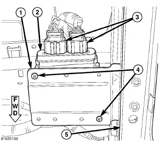 3. Carefully position the OCM to the OCM bracket (1). When the OCM is correctly positioned, the connector on the module will be pointed rearward in the vehicle and the locating pins on the module will be engaged in the bracket.
