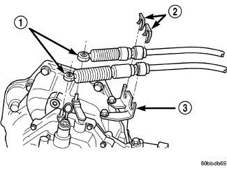 6. Install gearshift cables (1) to mounting bracket and fasten with NEW clips (2). Make sure clips are installed flush to bracket.