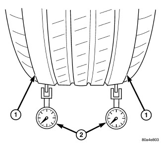 c. Check system runout using Dial Indicator Set, Special Tool C-3339A with 25-W wheel, or equivalent. Place the end of the indicator against each taped area (one at a time) (2) and rotate the tire and wheel. System radial runout should not exceed 0.76 mm (0.030 inch) with no tread "dips" or "steps." Tread "dips" and "steps" can be identified by spikes of the dial indicator gauge.