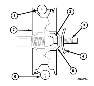 Measure radial runout of the wheel at the tire bead seat (1, 6). Runout should not exceed the specification limit listed in the following table. Replace the wheel if it exceeds the limit.