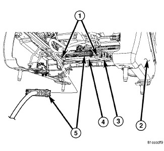 4. Unsnap the tabs (1) holding the memory seat module (4) into the retaining bracket (3).