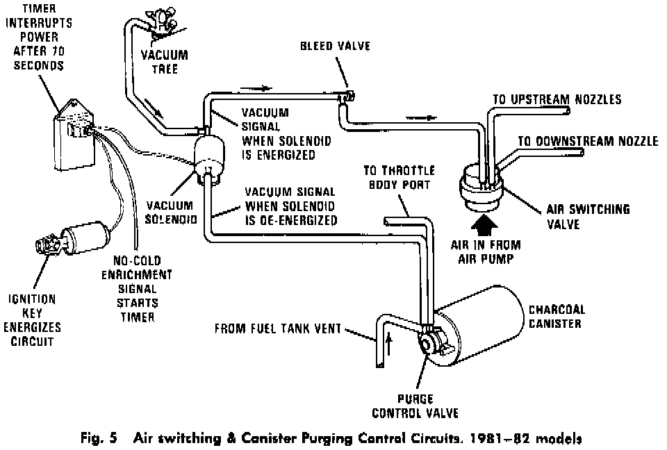 The vacuum solenoid valve is controlled by the ignition key, a 70 second-delay time and the presence or absence of a cold enrichment signal from the EFI electronics. When the engine is started, the vacuum solenoid valve is energized, causing upstream air injection. After starting, the solenoid remains energized until the circuit is interrupted by the conclusion of the 70-second delay from the timer. At this point, downstream air injection starts. If the engine is cold when started, the cold enrichment signal from the EFI must first end before the 70 second time delay can begin. If the engine is hot, there will be no cold enrichment signal and downstream air injection occurs after 70 seconds.