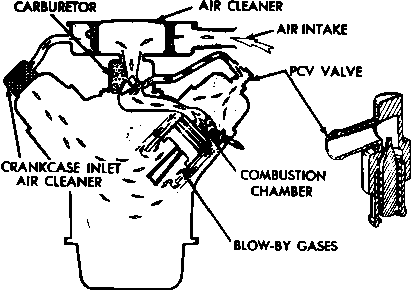 When the engine is running, air is drawn by manifold vacuum from the air cleaner through a hose, to the crankcase inlet air cleaner. From the crankcase inlet air cleaner, the air mixes with the vapors in the rocker arm chamber and crankcase and are then drawn up through the PCV valve in the cylinder head cover to a hose connected to either the intake manifold or carburetor base. These gases become part of the calibrated air/fuel mixture and are then drawn into the combustion chamber, burned and expelled with the exhaust gases.