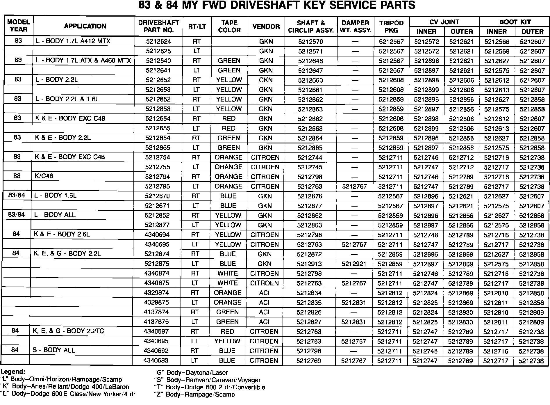 The driveshaft key parts chart was developed to assist you in identifying the frequently used service parts for driveshafts used in production during the 1983-1984 model years. Refer to the Front