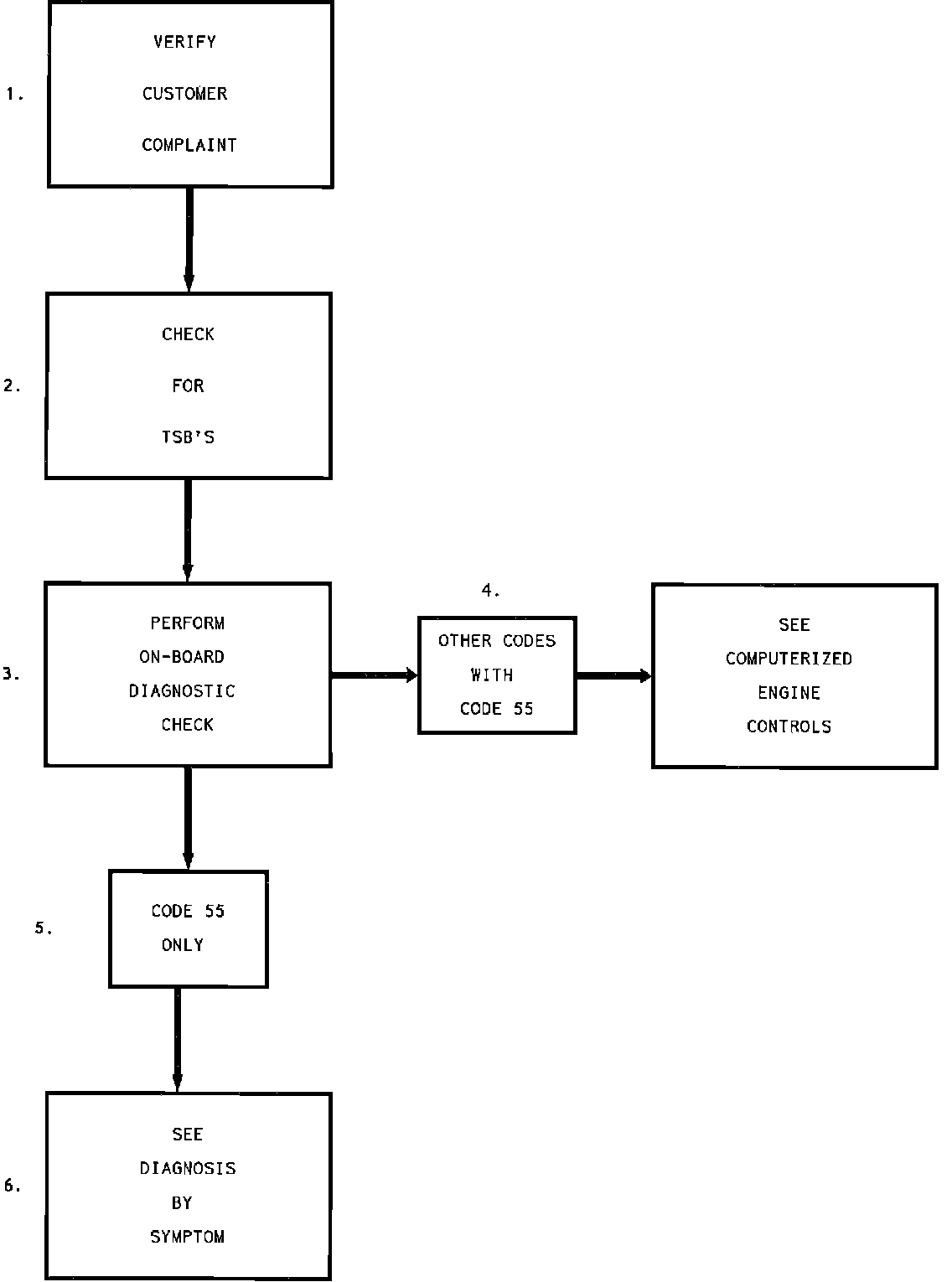 4. If "CHECK ENGINE" light is on, or codes other than code 55 are stored (code 55 is an end of message code), you must refer to Computerized Engine Controls section. This step also checks to see that the on-board diagnostics are working. If after correcting problem excessive emission levels exist proceed to step 4.