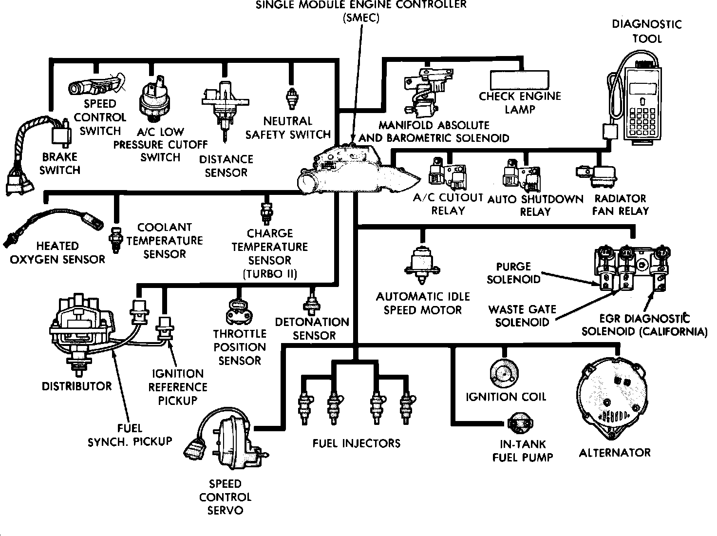Various sensors provide the input necessary for the SMEC to correctly regulate fuel flow at the fuel injectors. These include manifold absolute pressure, throttle position, oxygen feedback, coolant temperature, charge temperature (Turbo II), vehicle distance and detonation sensors. In addition to the sensors, various switches also provide important information. These include transmission neutral safety, brake, speed control and A/C clutch switches. These signals cause the SMEC change either the fuel flow at the injector, ignition timing or both.