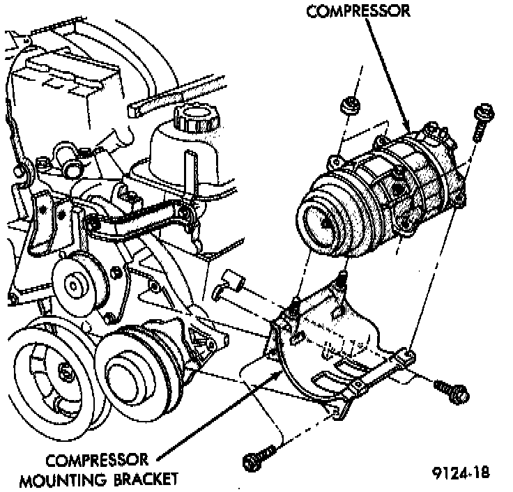 1. Disconnect negative battery cable, loosen and remove drive belts, and disconnect compressor clutch wire lead.