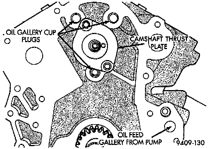 8. Check camshaft endplay With new thrust plate the specification is 0.0127 to 0.304 mm (0.005 to 0.012 inches.). Old thrust plate specification is 0.31 mm (0.012 in.) maximum. If not within these limits install new thrust plate.