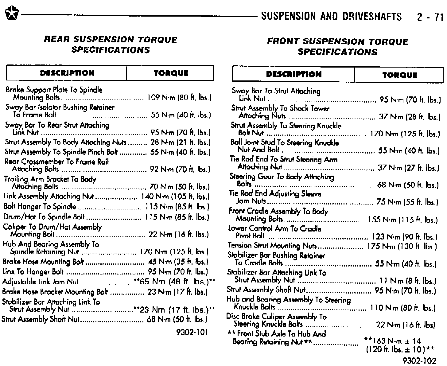 The adjustable link jam nut and stabilizer bar link-to-strut assembly nut torque on Page 2-71 of the 1993 Concorde/Intrepid/Vision (Publication No. 81-270-3140), were revised in Nov. 1992 on Technical Service Bulletin 02-07-92. The front stub axle to hub and bearing retaining nut torque, also on Page 2-71, was revised in Sept. 1994 on Technical Service Bulletin 02-13-94. The later Technical Service Bulletin did not pick up the revision made in 1992. The purpose of this Technical Service Bulletin is to include both revisions on the same Service Manual Page. The revisions are highlighted with **ASTERISKS**.