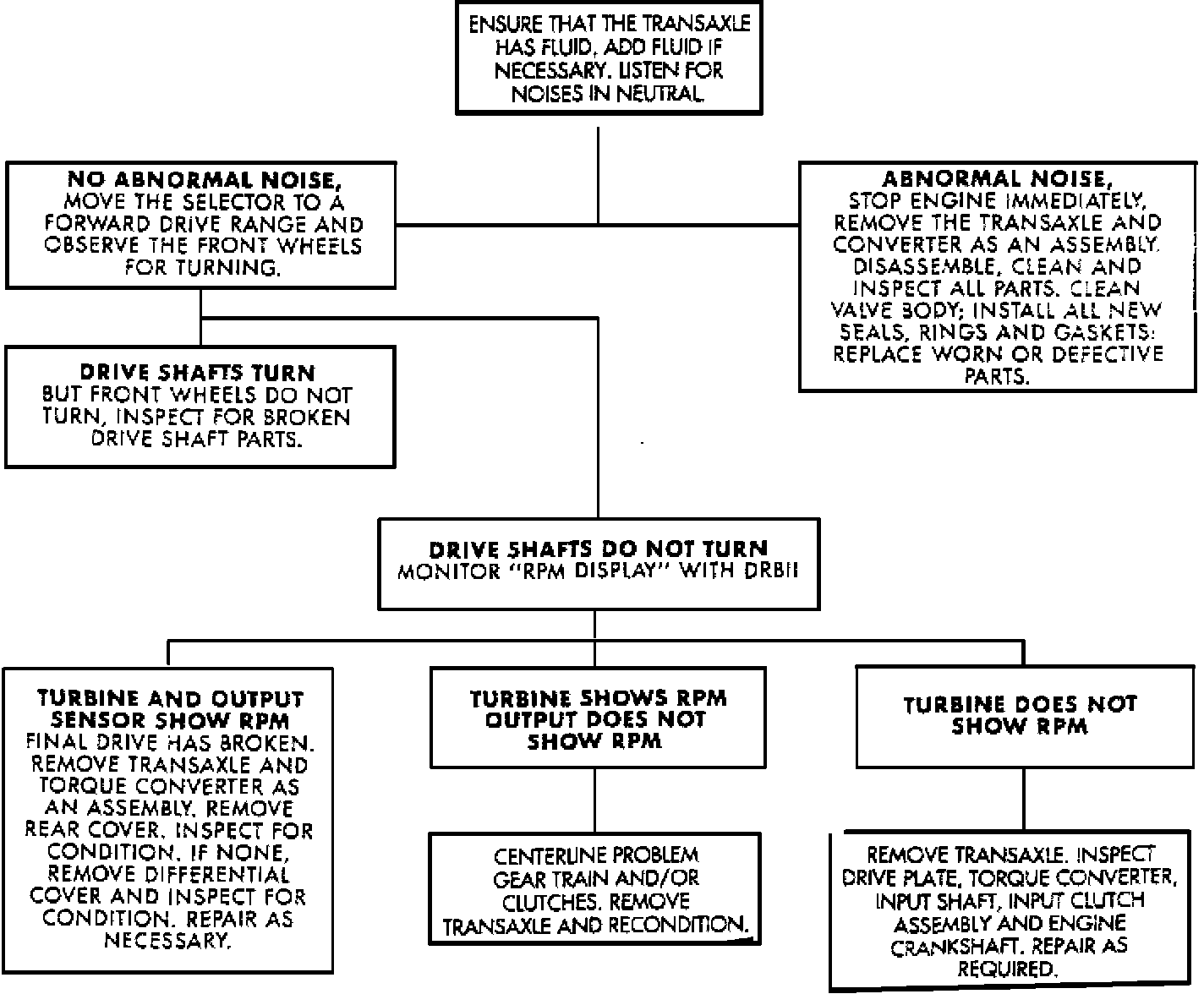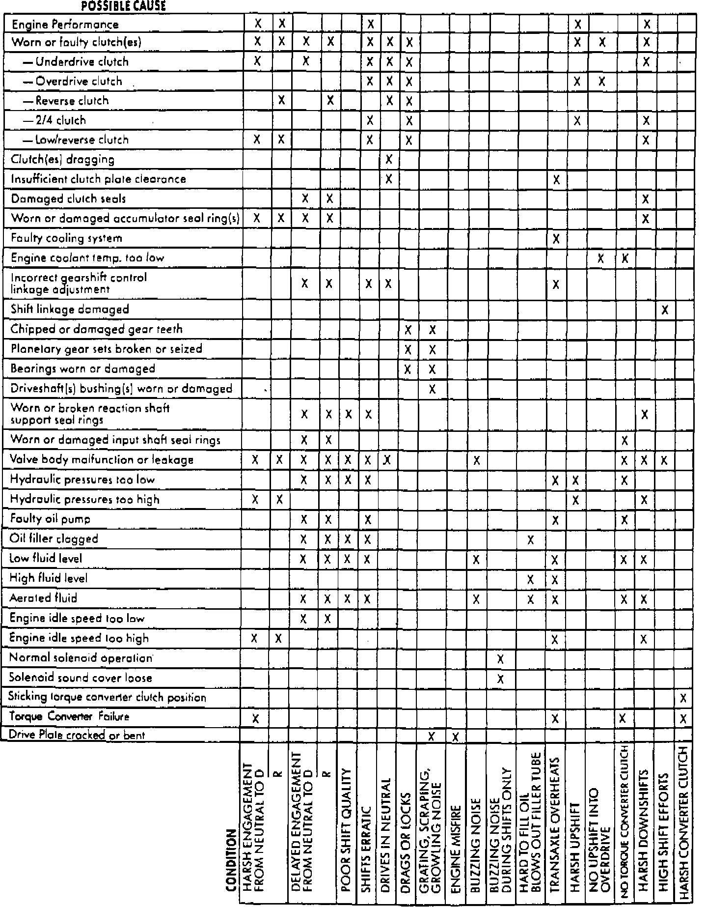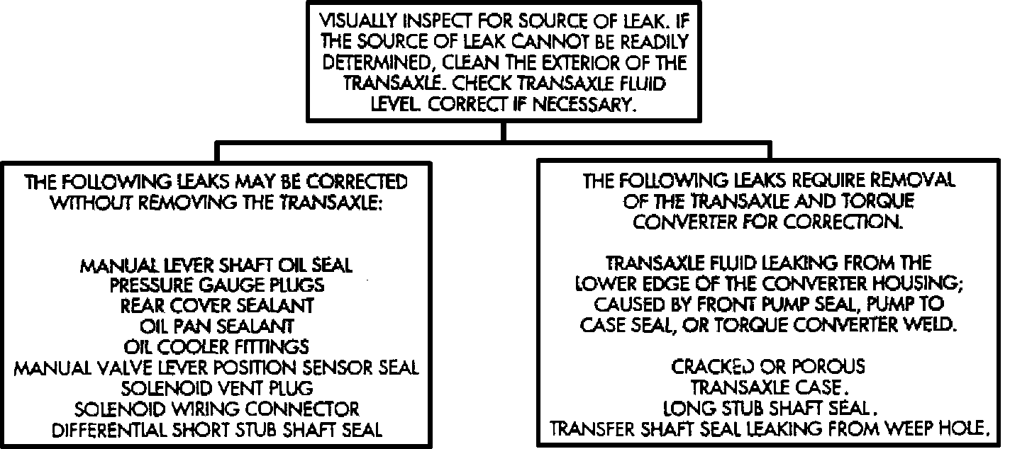 Prior to attempting any repair on the 42LE transaxle, general engine performance, transaxle fluid level and shift linkage must first be checked and adjusted, if necessary. For specific symptom diagnosis, refer to Figs. 2 through 5.