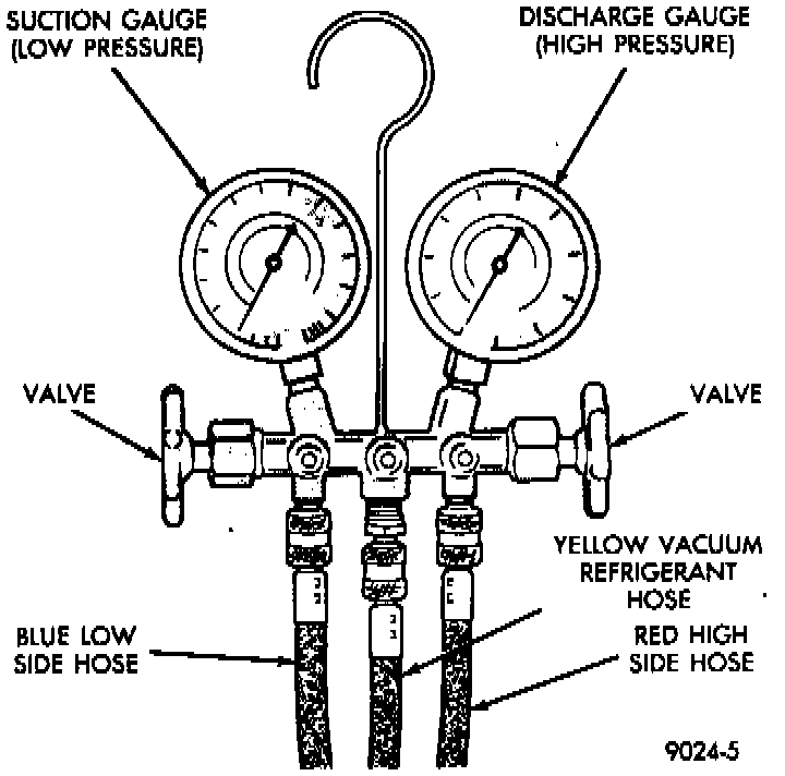 The center manifold YELLOW or WHITE hose is used to discharge, evacuate, and charge the refrigerant system. When the discharge or suction valves are opened the refrigerant in the system will escape from the hose.