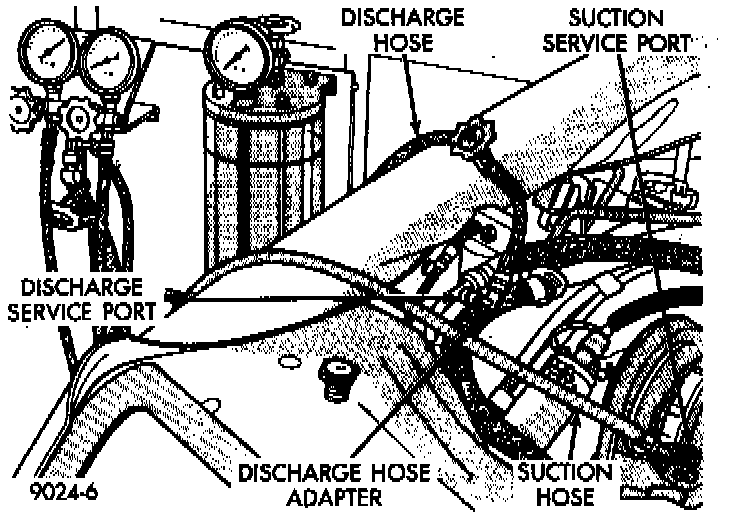 1. Remove the cap from 3/8 in. service port on the air-conditioning compressor or on the suction line near the compressor.