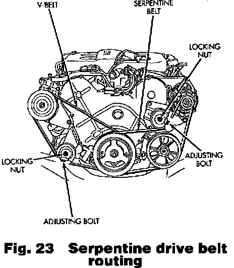 Refer to Fig. 23 for serpentine drive belt routing.