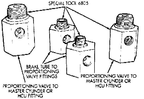 The in-line proportioning valves used in this system require special pressure fittings set No. 6805, or equivalent, to test for proper valve function. The fittings are installed before and after the proportioning valve being tested to verify valve is maintaining the required hydraulic pressure to the rear wheel brake which it controls. The pressure gauges used for testing the in-line proportioning valves on both non-ABS and ABS systems is Pressure Gauge Set No. C-4007-A, or equivalent.