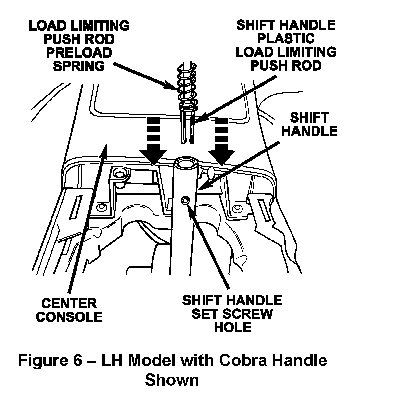 15. Orient the new load limiting push rod so that the forks are parallel with the center console (Figure 6). Insert the load limiting push rod, with the preload spring in position, into the shift lever. Be sure that the push rod is fully seated.
