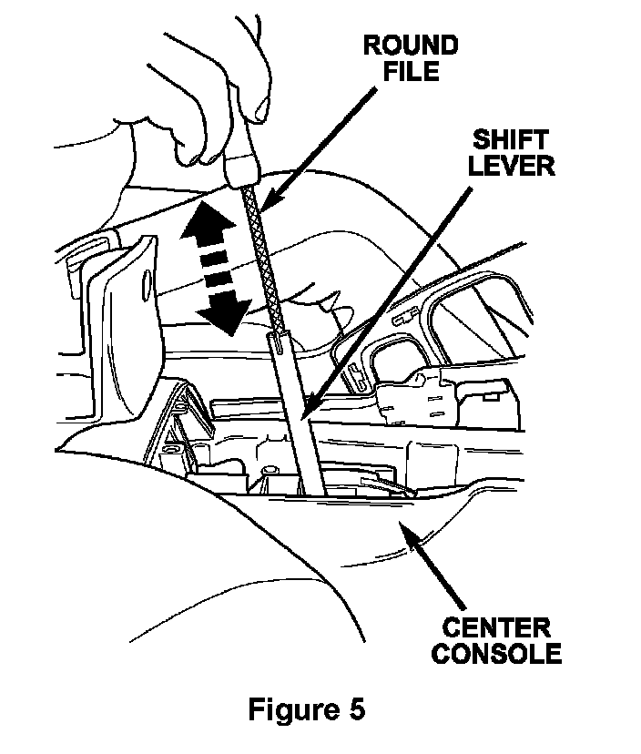 14. For vehicles that had the dimple drilled out, use a small round file to remove any remaining metal burrs from the inside of the shift lever at the hole drilled in Step 9 (Figure 5).