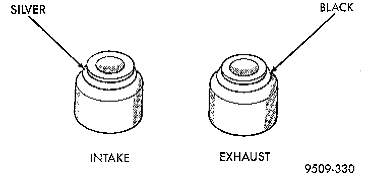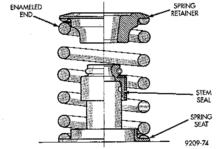 4. Install valve spring with the enamelled ends facing the rocker arms. Install valve springs and retainers. Compress valve springs only enough to install locks, taking care not to misalign the direction of compression. Nicked valve stems may result from misalignment of the valve spring compressor.