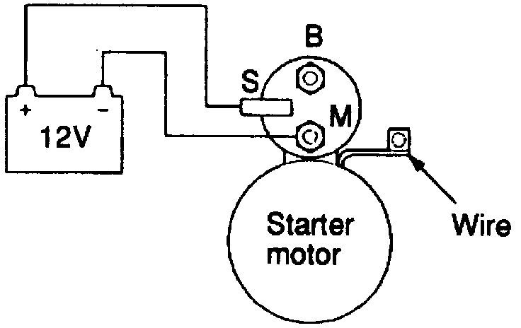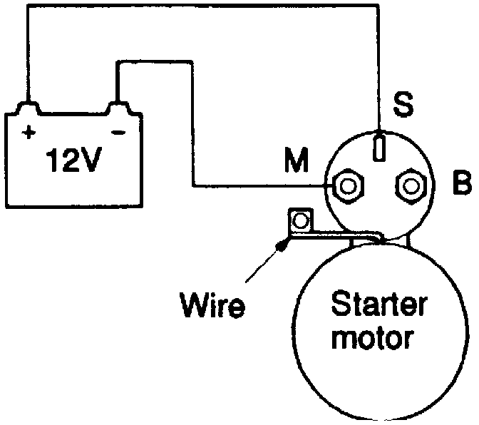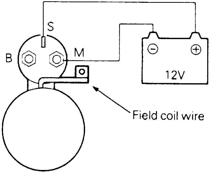 2. Connect a 12 volt battery between terminals S and M. This test must be performed quickly (in less than ten seconds) to prevent coil from burning.