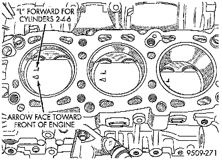 REMOVAL1. Identify pistons with matching cylinder. The pistons are not interchangeable from bank to bank. Pistons with the letter R and arrow toward the front of engine are to be installed in cylinders 1-3-5. Pistons with the letter L and arrow toward the front of engine are to be installed in cylinders 2-4-6.