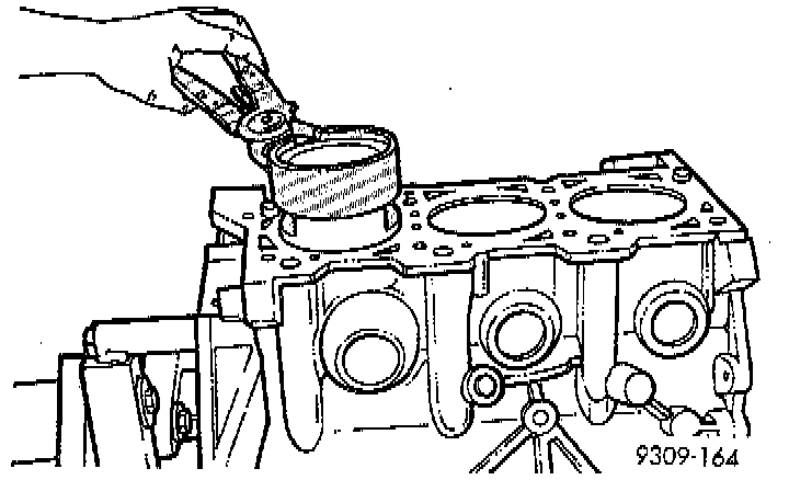 7. Tap the piston down in cylinder bore, using a hammer handle. At the same time, guide connecting rod into position on connecting rod journal.