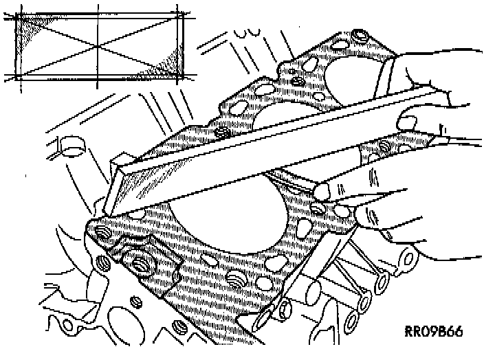 1. Clean cylinder block and check top surface for distortion with a straight edge and thickness gauge.
