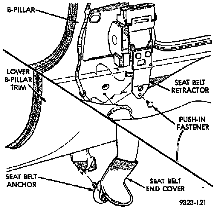 2. Install push-in fastener to hold seat belt retractor to floor kick-up below B-pillar.