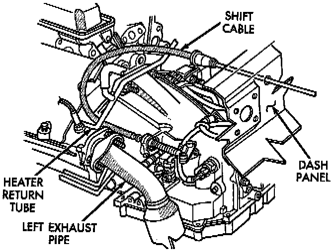 1. Route new cable from underside of vehicle The cable must be routed between the engine block and the heater return tube.