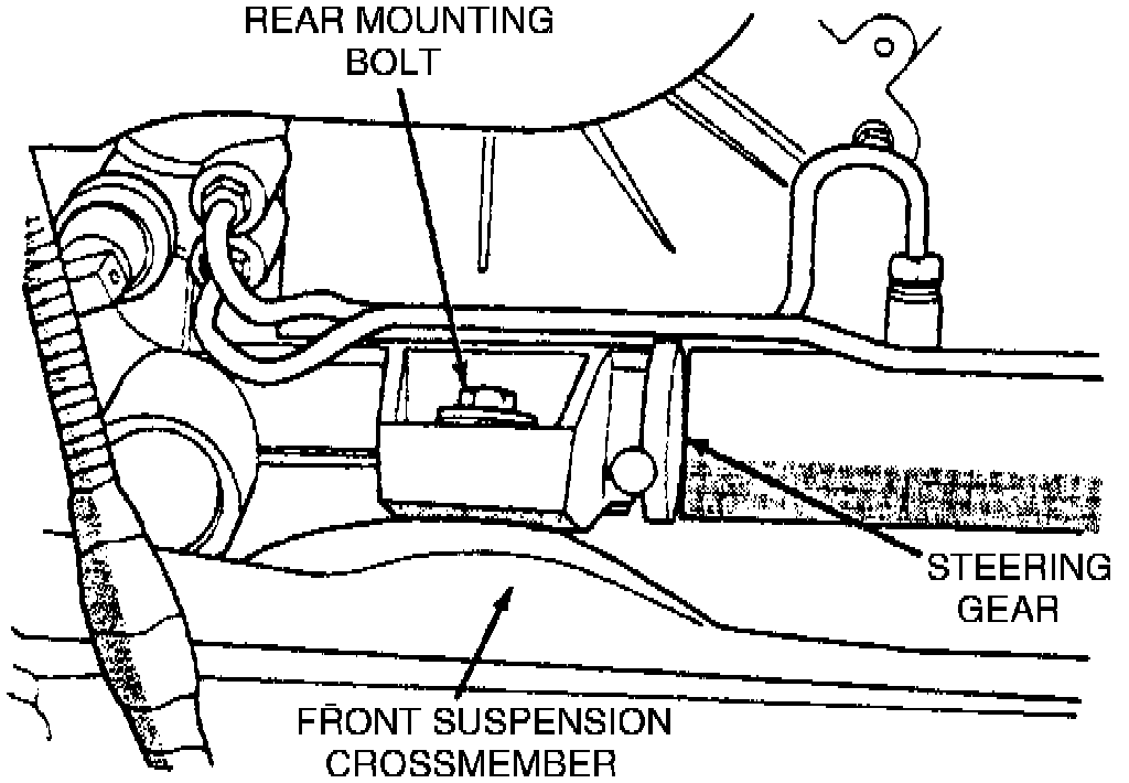 18. Remove two bolts at isolators attaching steering gear assembly to front suspension crossmember, then the two bolts attaching steering gear saddle bracket to front suspension crossmember.