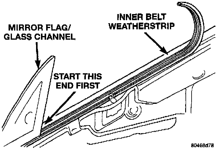 2. Press the leading edge of the weatherstrip forward until edge is tight to the mirror flag.
