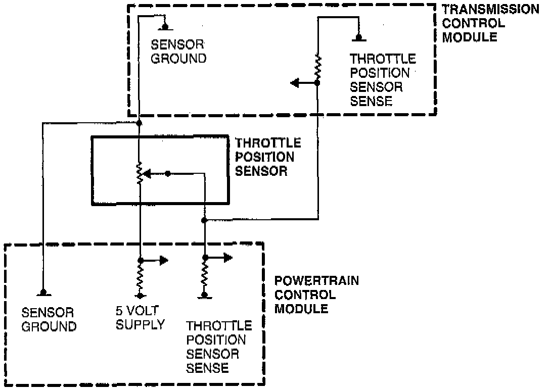 The Throttle Position Sensor (TPS) is used by the TCM to help determine shift points and shift quality Additionally, the TPS output is spliced to the PCM for fuel control. The PCM provides a 5 volt supply and ground for the sensor. Target idle speed is compared against actual engine speed to determine the learned TPS value for closed throttle idle. This is done to correct for differences in system voltage and sensor tolerances.
