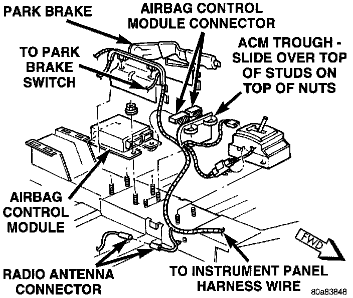 1. Install ACM, position ACM (arrow pointing forward) on center tunnel area mounting studs. Attach the two rear mounting nuts and tighten to 14 to 19 N.m (125 to 170 in. lbs.) torque.